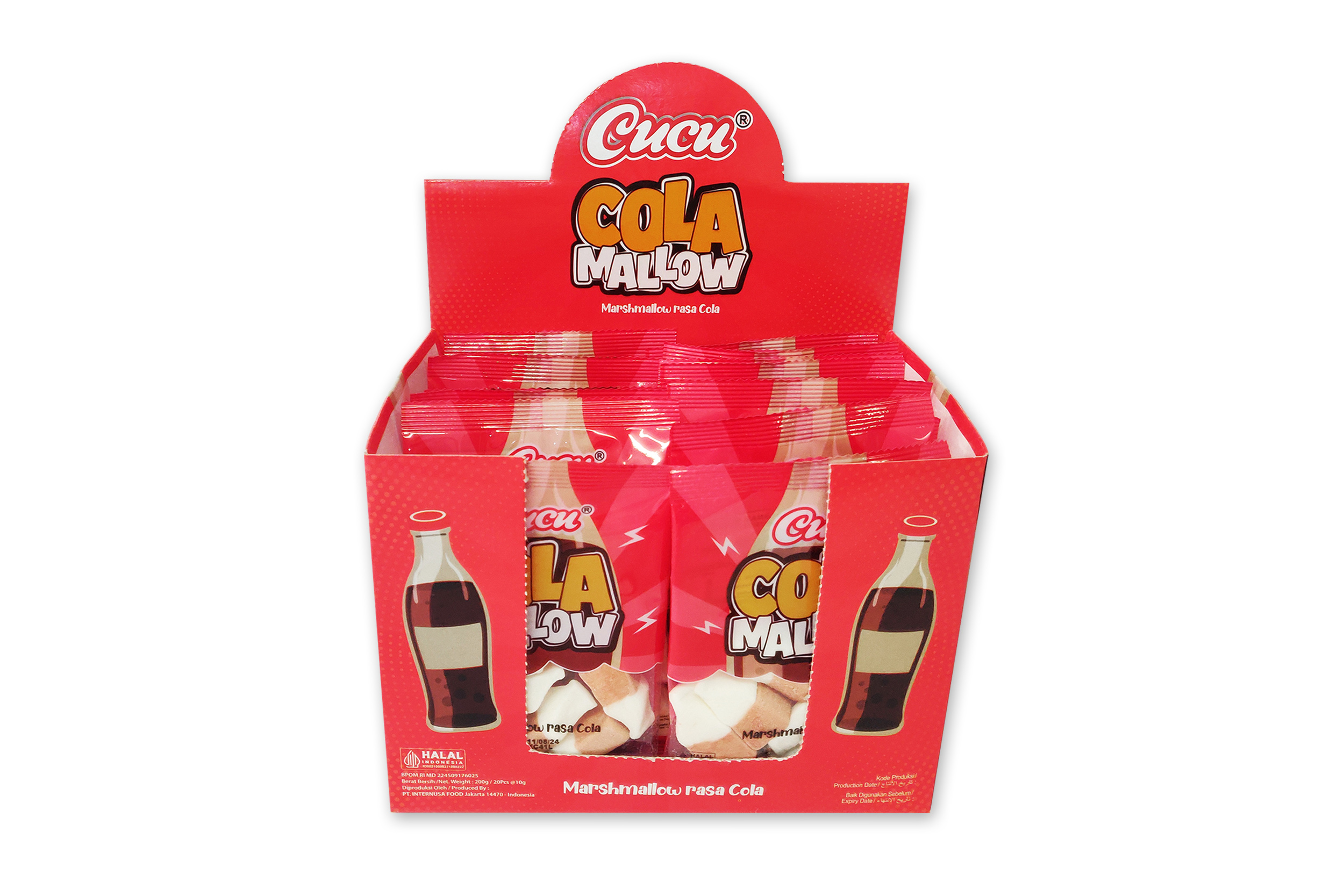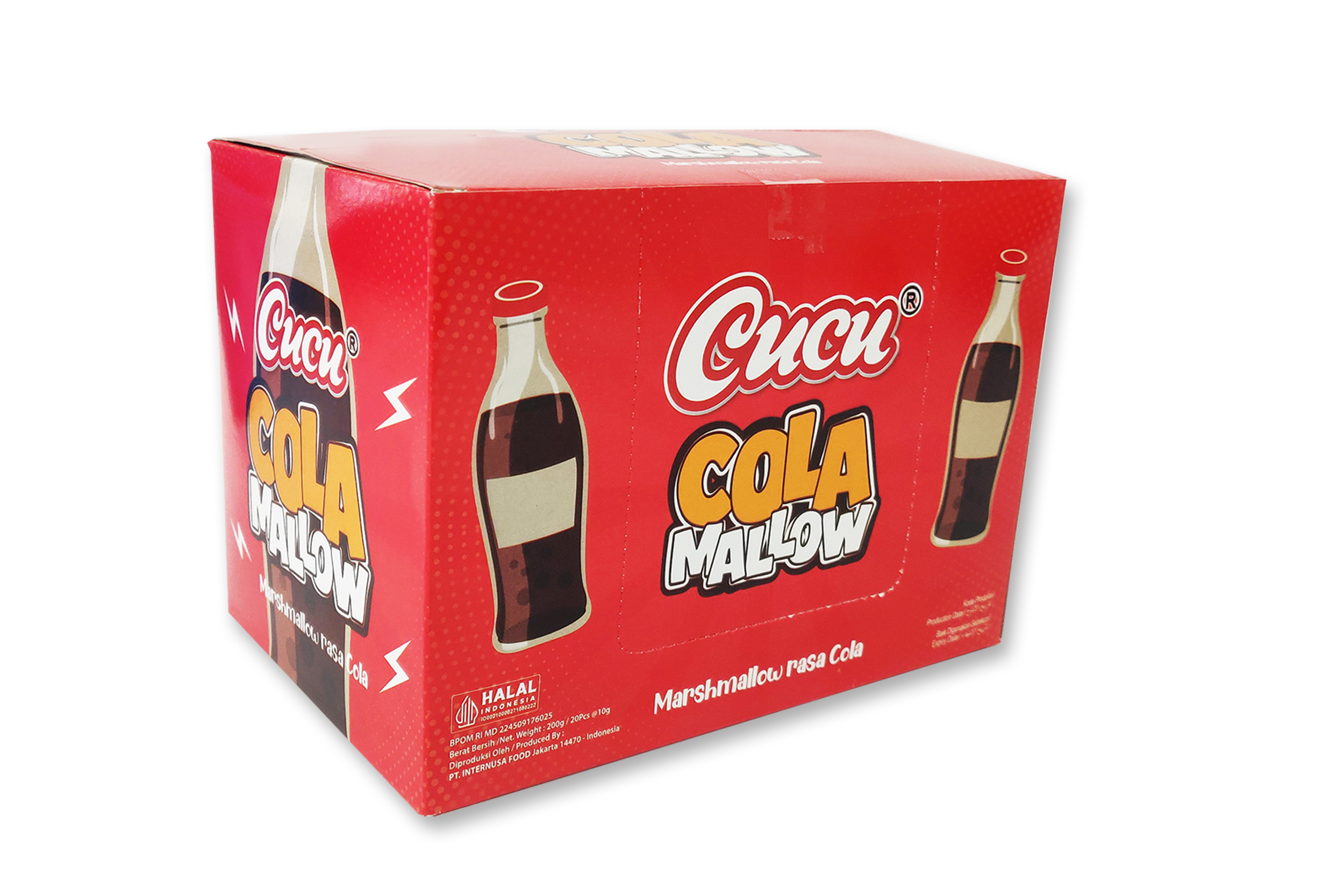 Ingredients : Glucose Syrup, Sugar, High Fructose Syrup, Dextrose Monohydrate, Stabilizer Beef Gelatin, Modified Starch, Corn Starch, Natural Sweetener Sorbitol, Synthetic Cola Flavor, Natural Color Caramel Class IV (E-150).