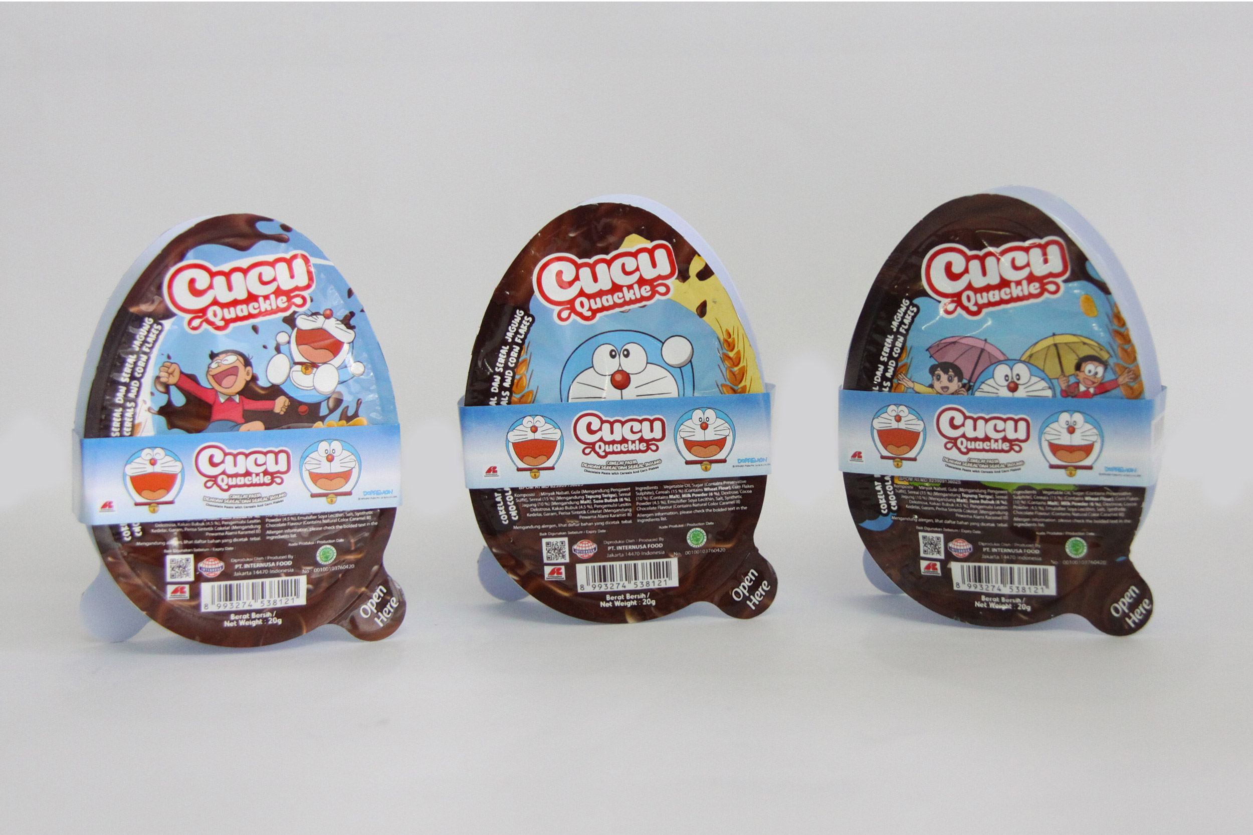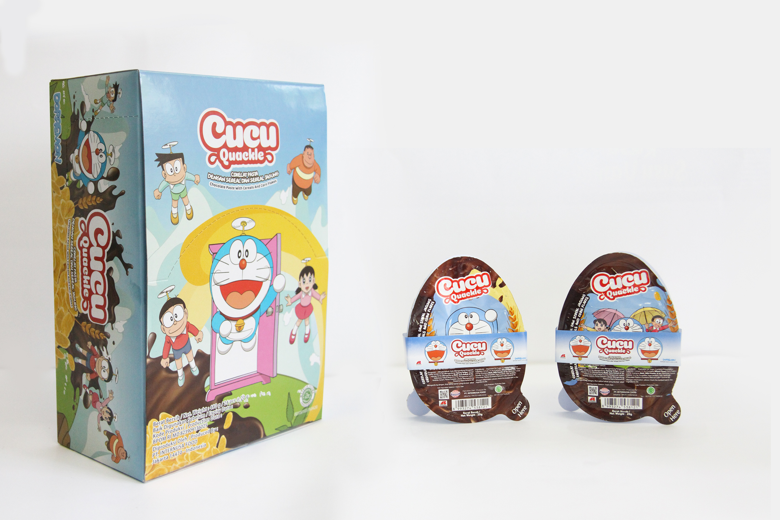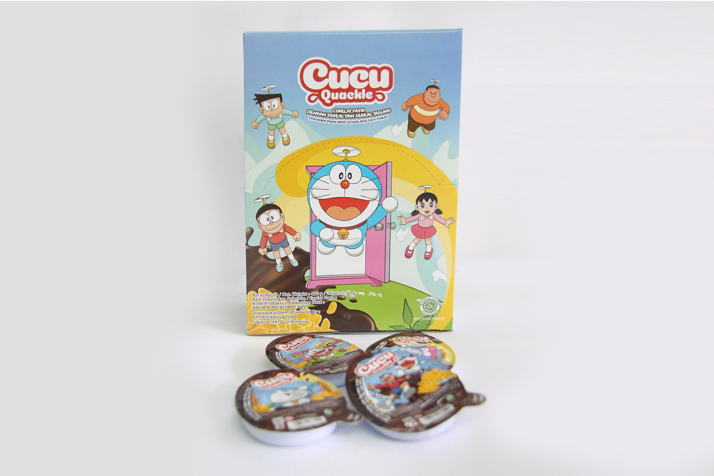 Cucu Quackle Chocolate Paste with Cereals and Corn Flakes is a healthy and delicious chocolate product suitable for breakfast and snacks. This product can be eaten with bread and children will surely enjoy this goodie all-day long. This product features the classic and famous Japanese animated character from our childhood time “DORAEMON” which higher the product positioning in the local market. This delicious and crunchy treat will give you an unforgettable experience!