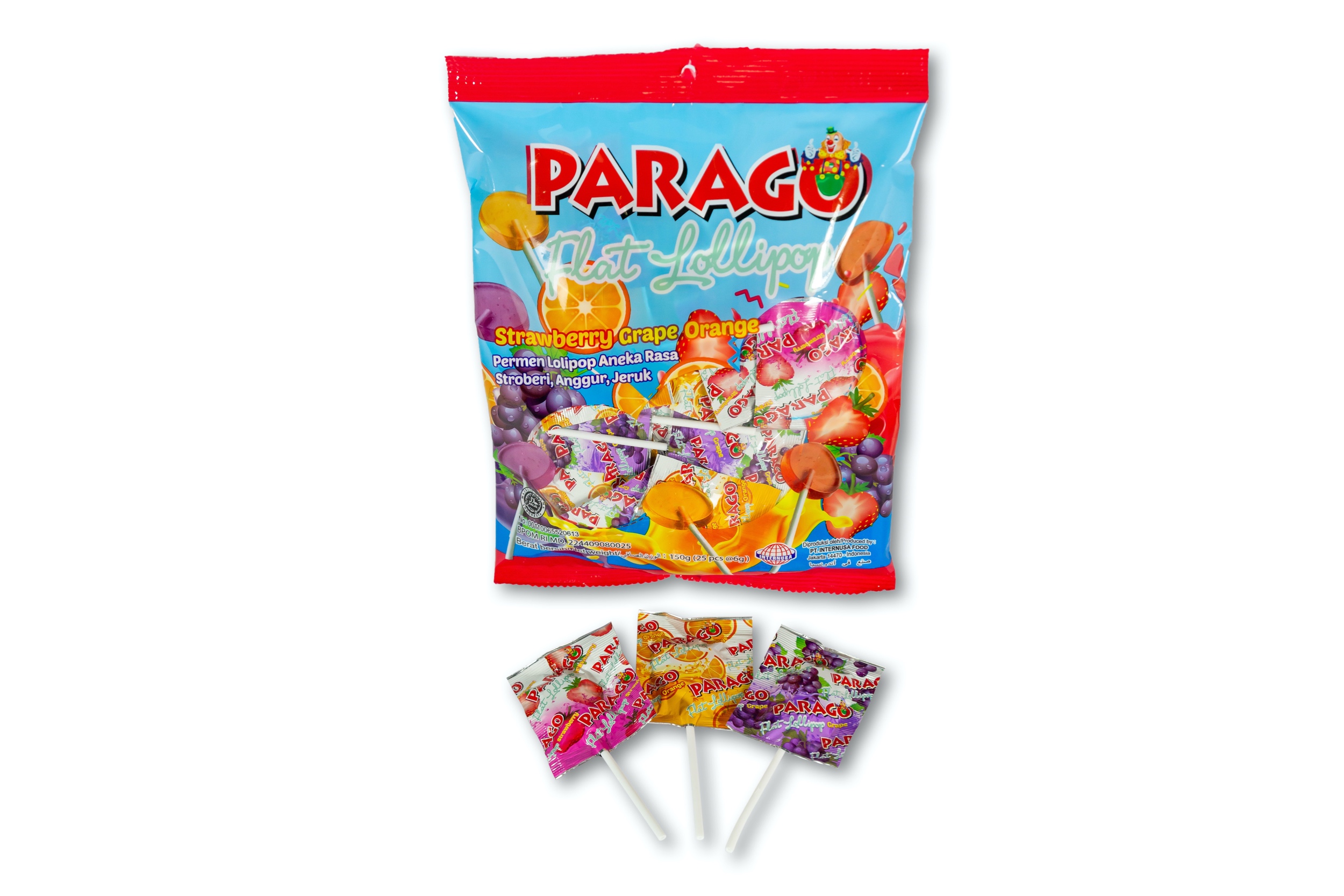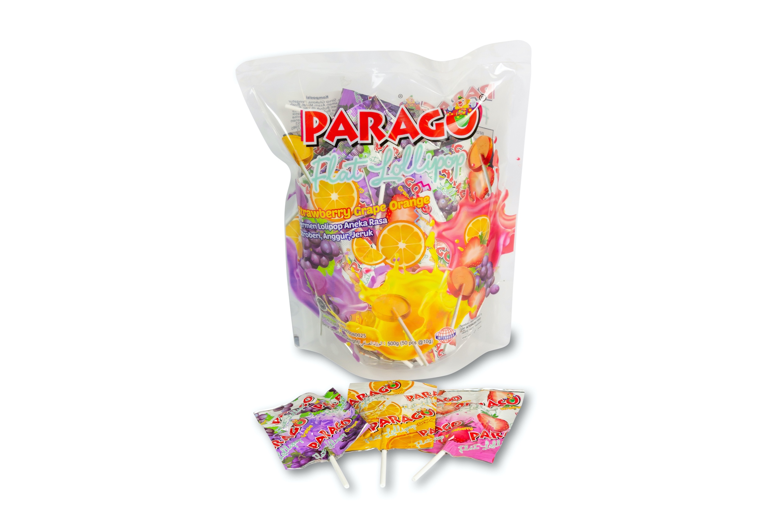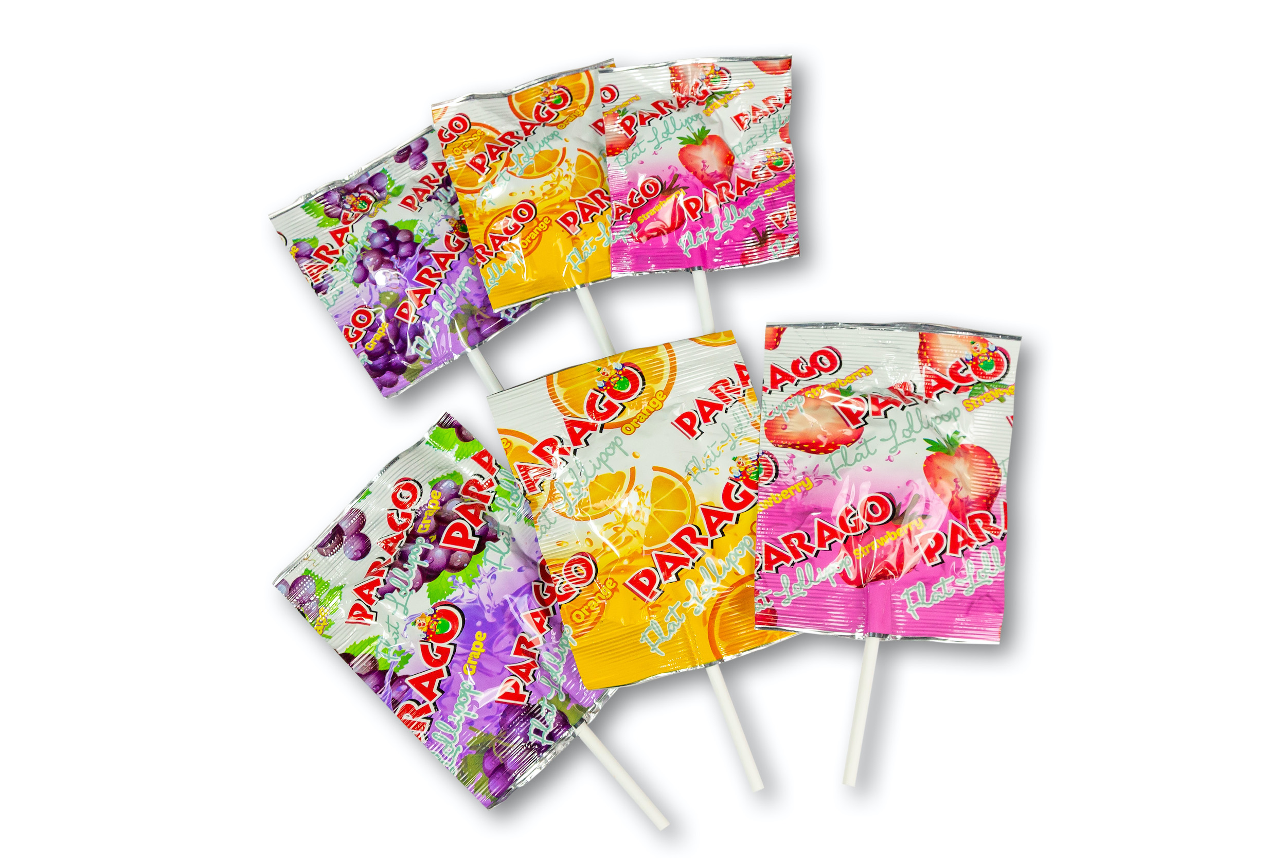 Treat yourself to a uniquely flat lollipop of assorted fruity flavours – Strawberry, Grape, and Orange. Parago Flat Lollipop is perfect for adding colour to your beautiful lollipop bouquets, prizes for young children,sweet treats for your school/office/dental/health clinic or to fill your goody bags and your candy jar. Try them all, and see which enticing flavour is your favourite. It is individually wrapped, perfect to be eaten on the go.